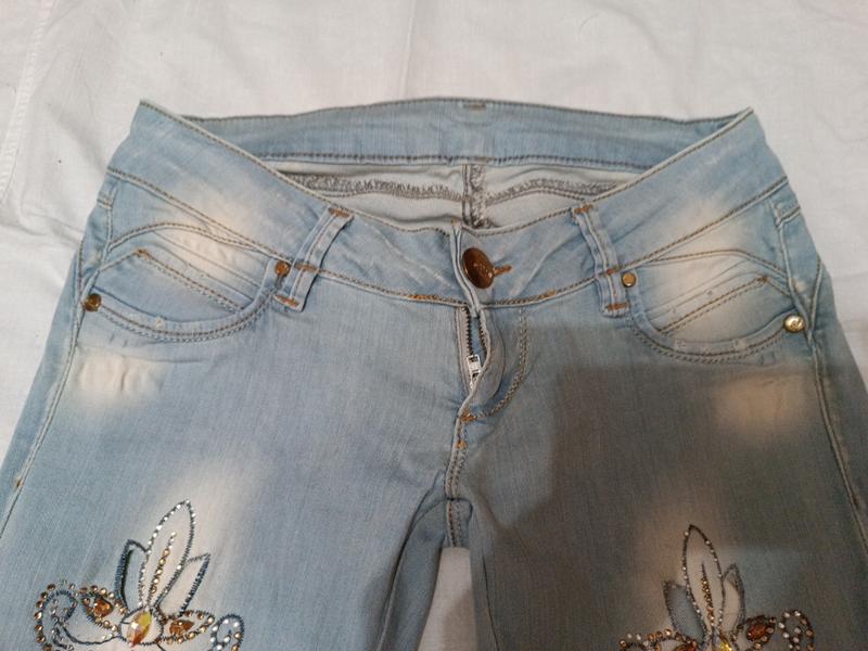 колir голубой с потертостями, вышивка из каменки и стразьев, на размир 38, стрейч, низ на молнии, скины, замеры: талия 38-42(тянется), бедруй, куколка 21,5,длинная94, посадка низкая перед 15, зад 30, пошагов 76