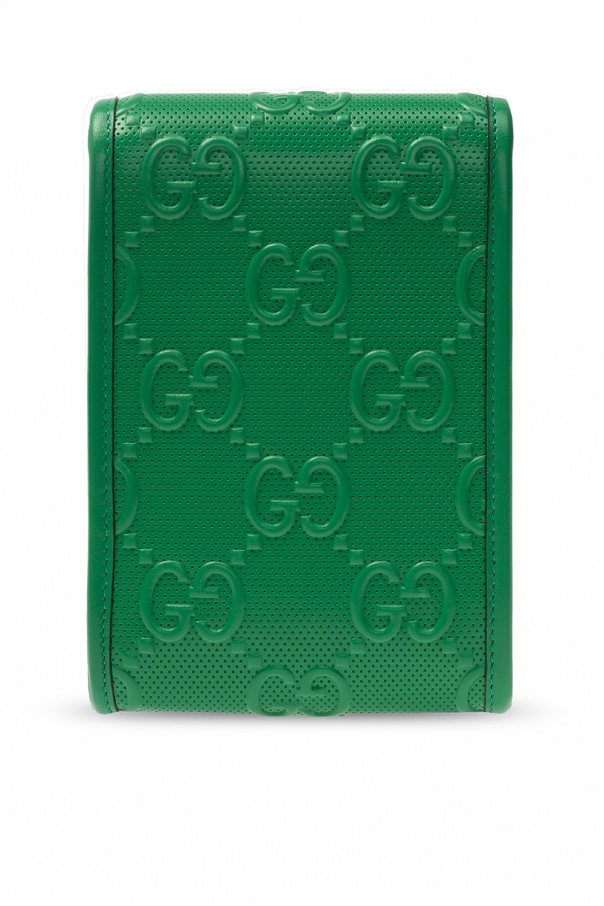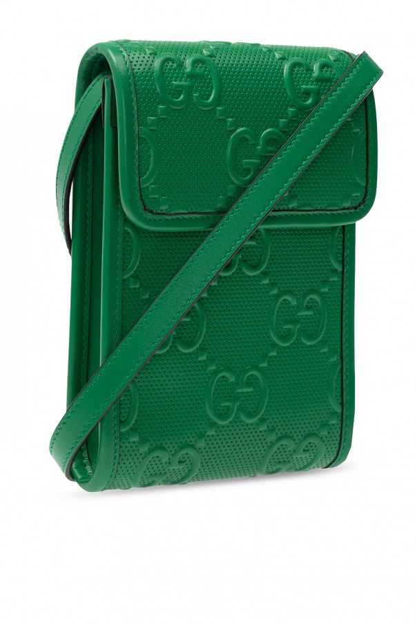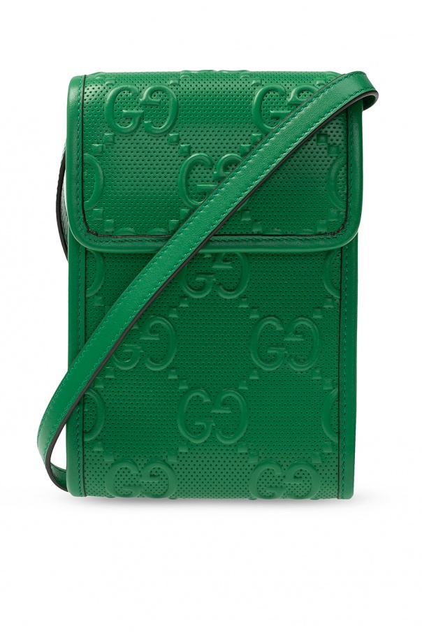 Green shoulder bag from Gucci. Crafted from leather with embossed logo of the label throughout, this item has snap fastening and interior with one compartment and two card slots.