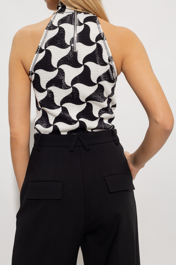 White and black sleeveless crop top from Bottega Veneta. Made of fabric with gathers, this garment features a back zip and geometric pattern inspired by Op-art.