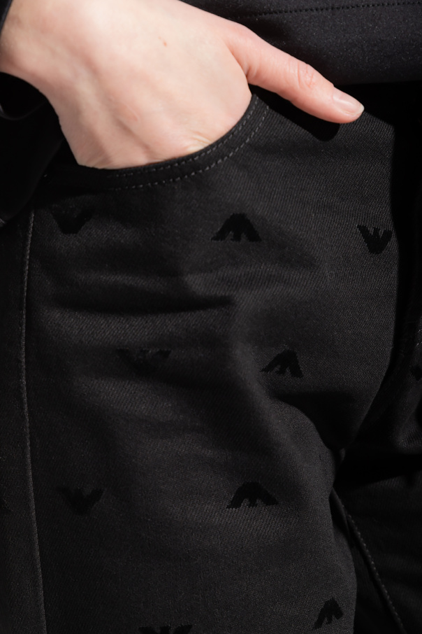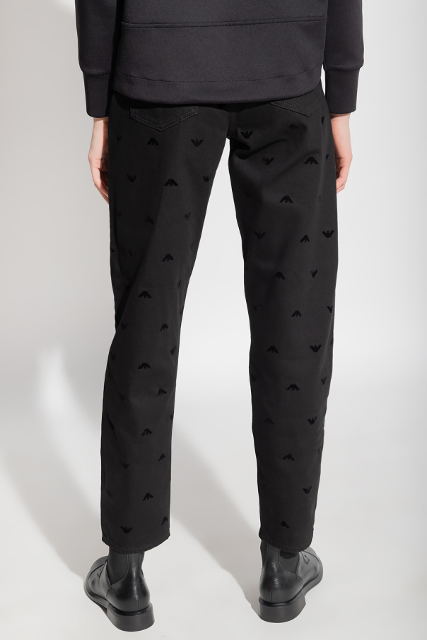 Black slim-fit jeans from Emporio Armani. Embellished with a velvet-flocked monogram pattern, this pair features a zip fly with a button, classic five pockets and a back patch with an embossed logo.