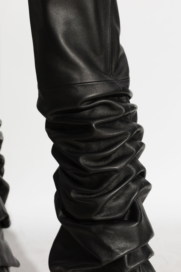 Introducing the exquisite \"Lena\" Pants from the exclusive collection by The Mannei. Crafted for the discerning woman, these luxurious black pants are designed from a material that emulates the opulence of leather, offering both sophistication and modernity. The construction of the \"Lena\" Pants is meticulously designed to enhance your silhouette. Featuring a classic waistline with a button and zip closure, these pants ensure a perfect fit. The standout feature is the dramatic, ruched detailing that starts at the knees and cascades down to the lower leg, adding a unique and bold flair. The back is adorned with traditional pockets, maintaining a timeless appeal. For a cohesive and stylish ensemble, pair these pants with a long, fitted jacket made from the same luxurious material. The contrasting red high-heeled shoes, as depicted, provide a striking accent against the deep black of the pants, making a powerful statement. Why Choose This Product? Luxurious material resembling leather for a sophisticated look. Classic waist with button and zip closure for a secure fit. Unique ruched detailing from the knees down for a dramatic effect. Timeless back pockets for a classic touch. Designed by The Mannei, a brand favored by celebrities such as Elsa Hosk and Hailey Bieber.
