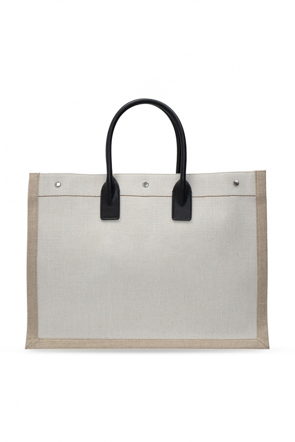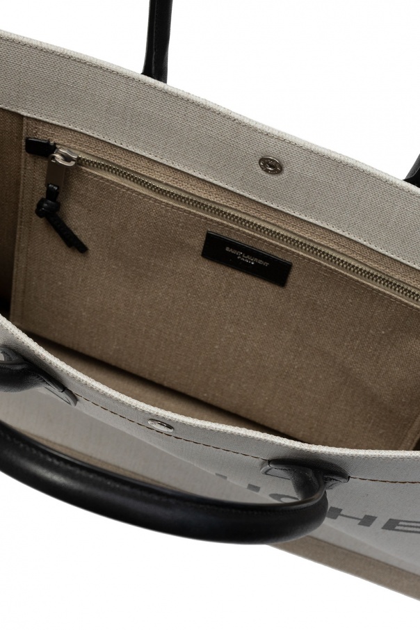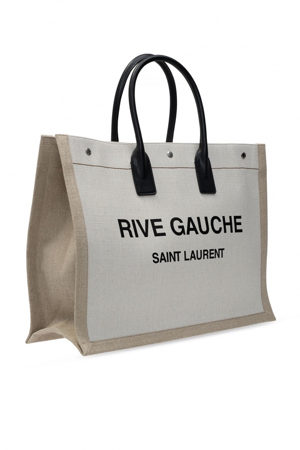 Beige ‘Rive gauche’ shopper bag from Saint Laurent. Fastened with a snap, this design features a snap fastening, white print, two half-round handles and one internal compartment with one zip pocket.