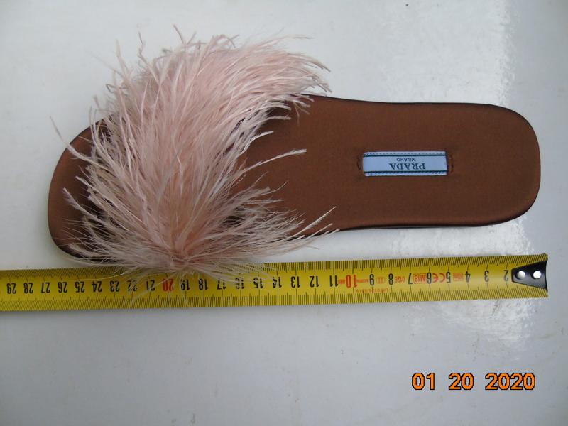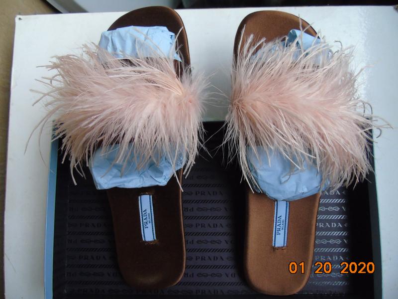 Продам коричневые пантолеты с каучуковой подошвой и широкой атласной перемычкой, украшенной бледно-розовыми перьями страуса. Сланцы с декором от Prada. -Модель выполнена из комбинированного состава в коричневом цвете и декорирована перьями. Бренд: PRADA Страна производства: Италия Состав: кожа, атлас. Внутренняя отделка: кожа. Подошва: каучук. Стелька: кожа Цвет: коричневый Размер 40-41. Длина стельки 26 см. ОРИГИНАЛ!!!!