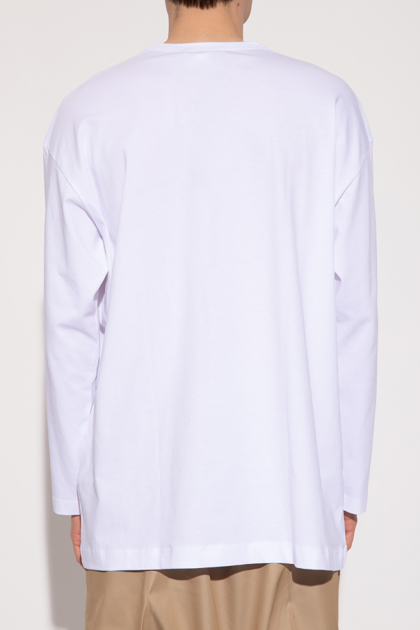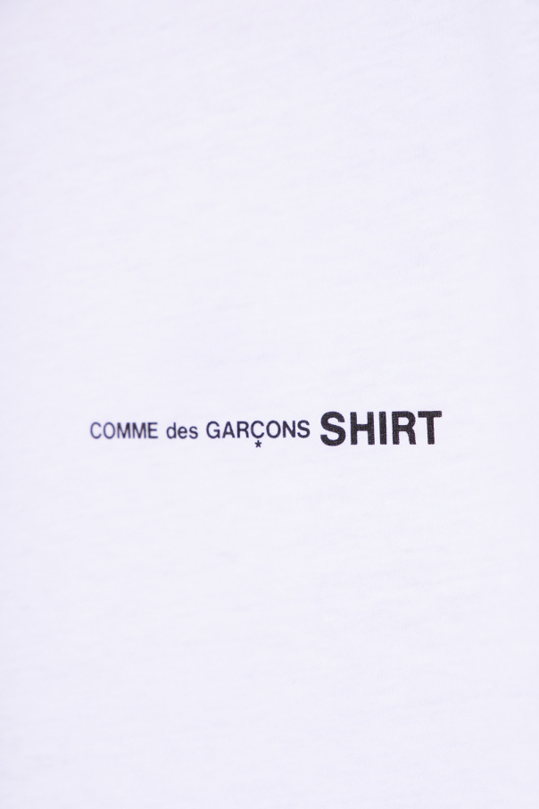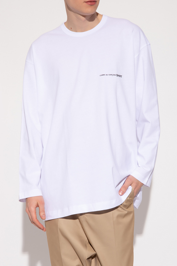 White crewneck T-shirt from Comme des Garcons Shirt. Made of cotton, this long sleeve design is decorated with a black logo print.