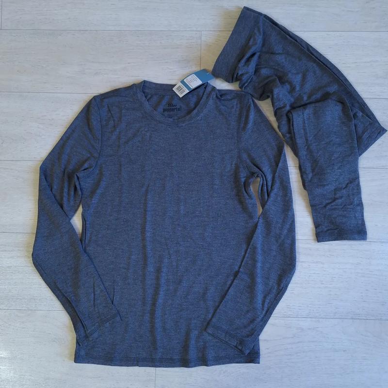 Термобелье Pepperts всё в размере 146-152. Тонкое, приятное к телу, хорошо тянется. Отличный состав 66% акрил, 28% вискоза, 6% эластан. Замеры темно-синего верх длина 54 см, рукав от плеча 53+плечо 7 см, ширина 34 см, низ длина 86 см, шаговый 63 см, пояс 30 см, бедра 33 см. Замеры темно-серого верх длина 53 см, рукав от плеча 52+плечо 7 см, ширина 35 см, низ длина 84 см, шаговый 62 см, пояс 30 см, бедра 34 см.