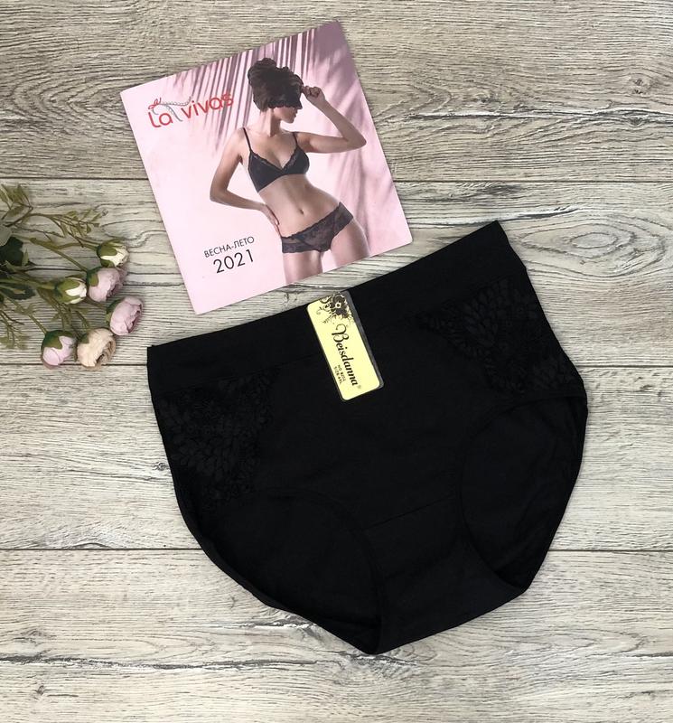 Трусики женские выполнены из нежного и мягкого хлопка с добавлением эластана высокой посадки с классическими резинками . По бокам модели - нежное кружево , нашитое поверх ткани . Классическая модель с широким боком и широкой трикотажной резинкой в области живота . Цвета в ассортименте - серый , бордовый , розовый ( уточняйте у менеджера ) . Размер в наличии : 4XL ( 52 ) . Замеры : Длина по резинке ( без растяжки ) - 33 см. Длина по резинке ( с растяжкой , до отказа ) - 46 см. Высота ( посадка ) - 31 см. Ширина бока - 15 см.