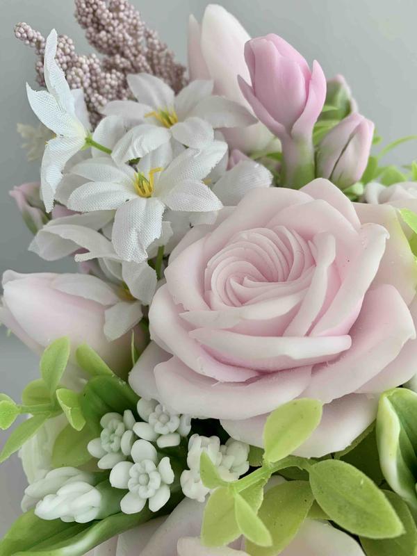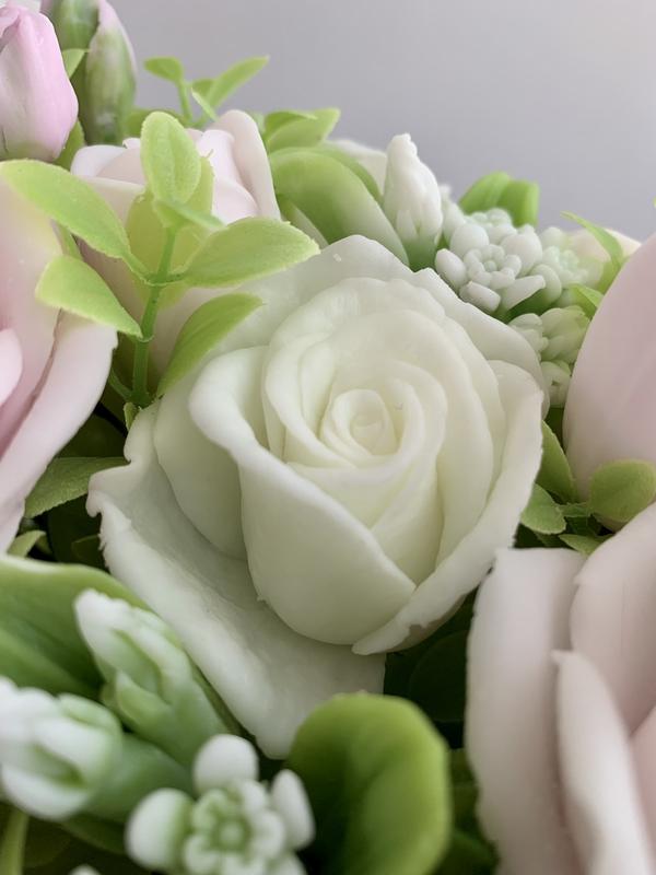 Під замовлення. Термін виготовлення 3-5 днів. Ароматна інтер'єрна композиція із мильних квітів. Їх часто купують для декору до будинку, офісу, квартири. Вони створюють приємну атмосферу, наповнюють приміщення квітковим ароматом, а також дарують гарний настрій! Такі букети не в'януть і довго приносять радість своїм власникам. Сувенір з мила - незвичайний і оригінальний подарунок, подарувати його можна будь-кому, з приводу і просто так! Запам'ятається на довго, а головне - ніколи не зав'яне! Розмір: 26/24 см Вага: 1000 грам