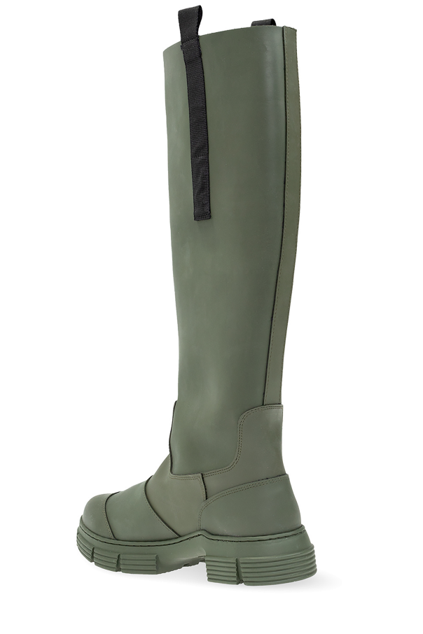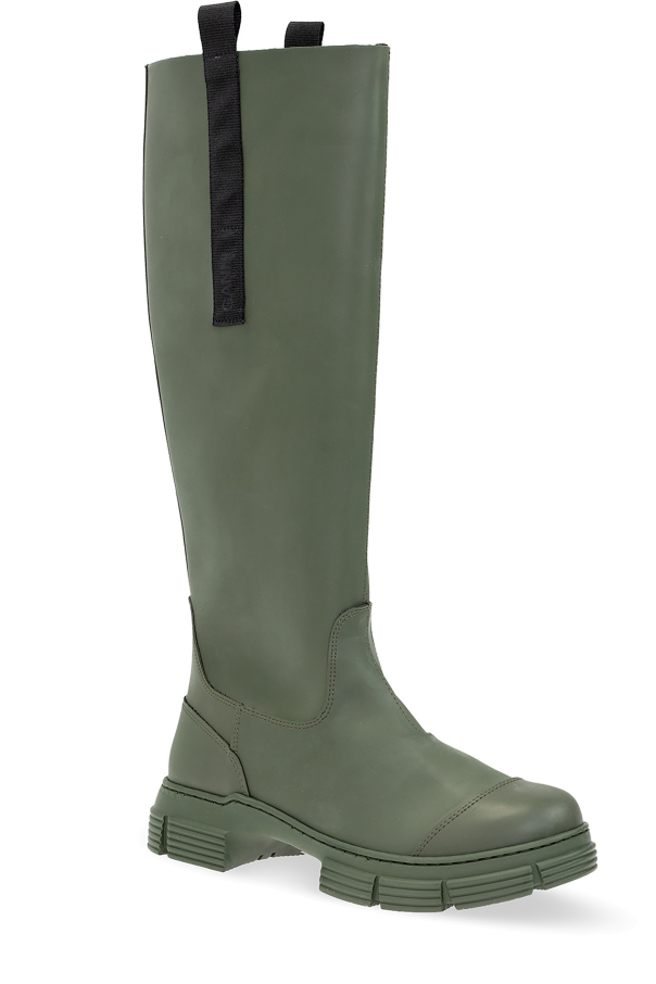 Green knee-high rain boots from Ganni. Crafted from recycled rubber, this pair sits on a green rubber sole and features two grosgrain straps and a logo print.