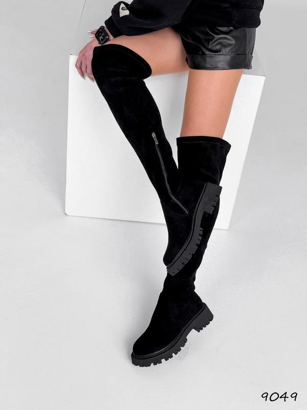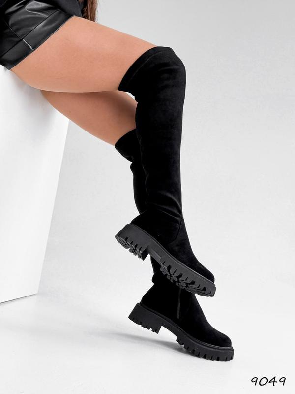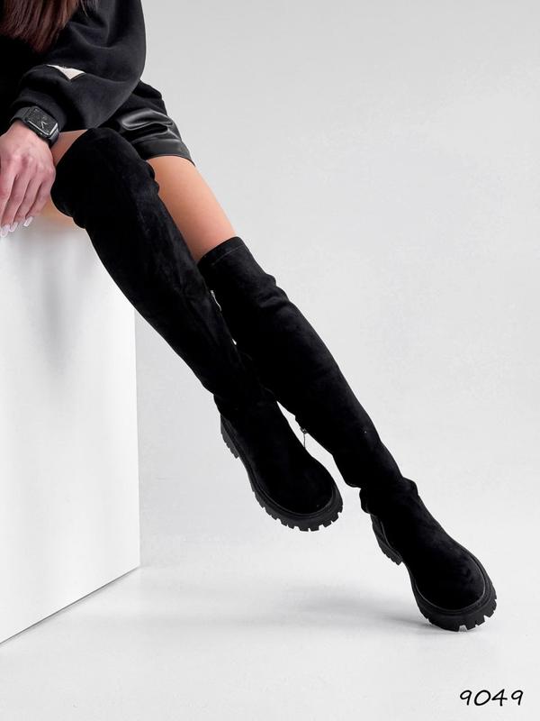 НОВИНКА Ботфорты женские Lilia черные, экозамша ЗИМА Код: 9049 Материал: экозамша Цвет: черный подошва: 5 см, спереди: 3 см Высота от пятки: 52 см Внутри набивной натуральный мех до щиколотки, выше флис по все высоты размер: 36-40 36-23 см 37-23,5 см 38-24 см 39-25 см 40-25,5 см (Замеры голени в прайсе)