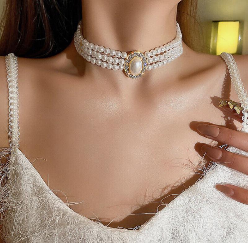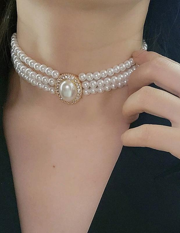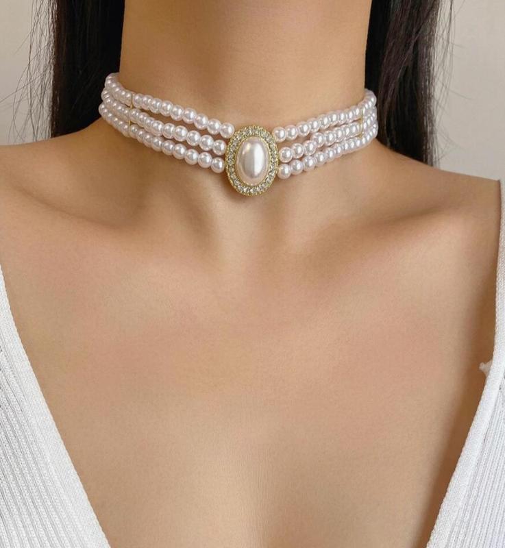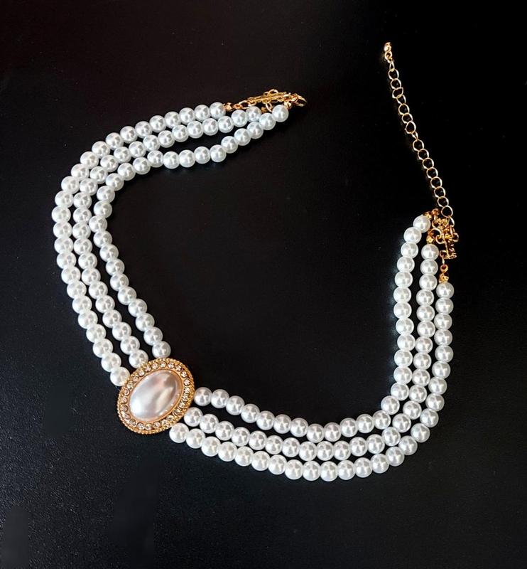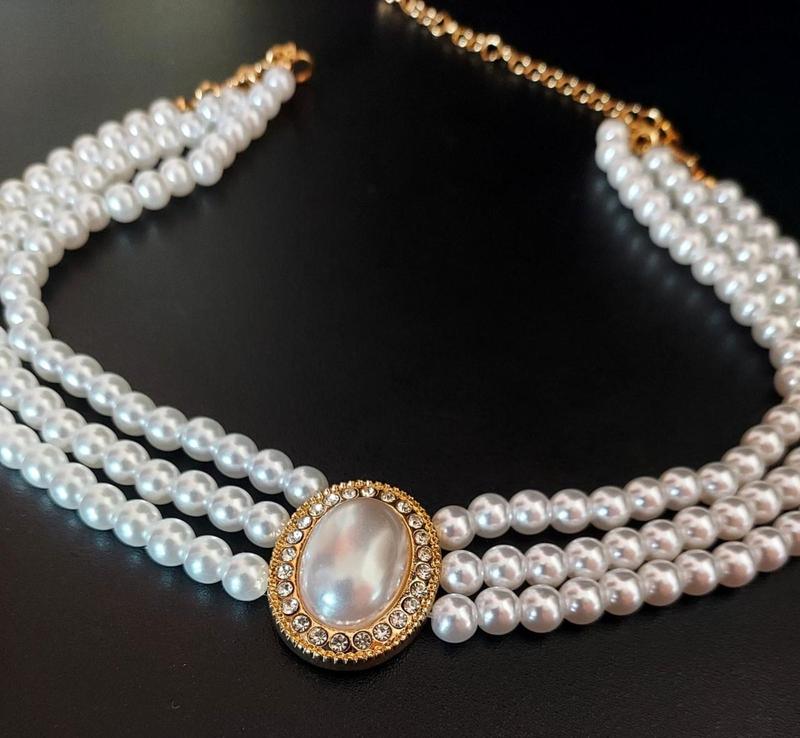 Кольє чокер Стильна прикраса, що акцентує на собі увагу широкий чокер із перлиною (імітація каменю) у стразах 3 нитки бусин зібрані в чокер Довжина 31+7 см Ширина 2 см Кулон 2.5х2.2см