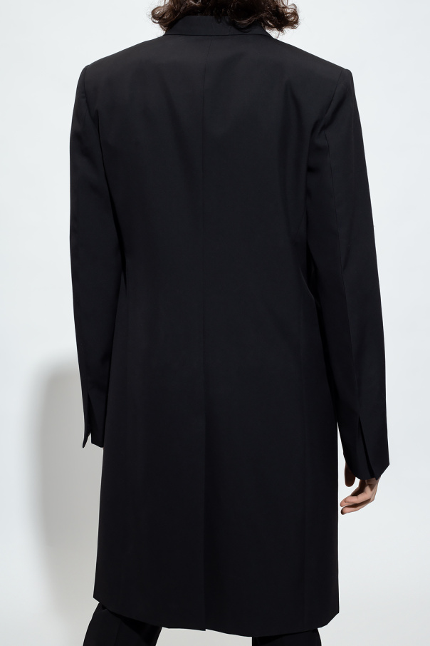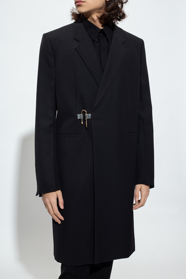 Black coat from Givenchy. Made of wool, this garment features button and decorative padlock closure in gold-tone, two slip pockets, single rear vent, notch lapels and long sleeves.