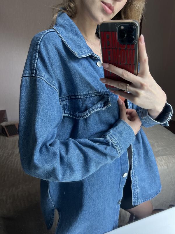 Джинсова рубашка Н&М Длина 74 Ширина 64 Длина рукава от плеча 54 Размер С, но она оверсайз, поэтому подойдет даже на ХЛ