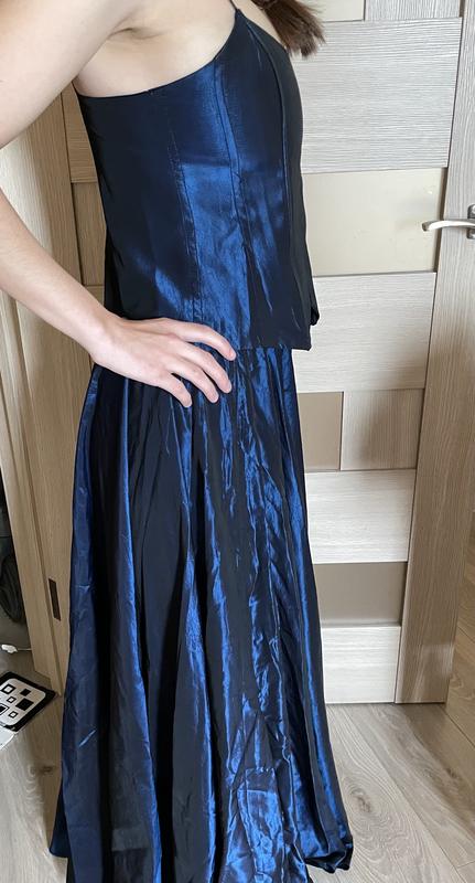 Сукня космічного синього кольору з двох елементів: корсет і спідниця.Корсет: Напівобхват грудей 40, довжина корсету 37. Спідниця: напівобхват талії 39, довжина спідниці 106. Розмір 40