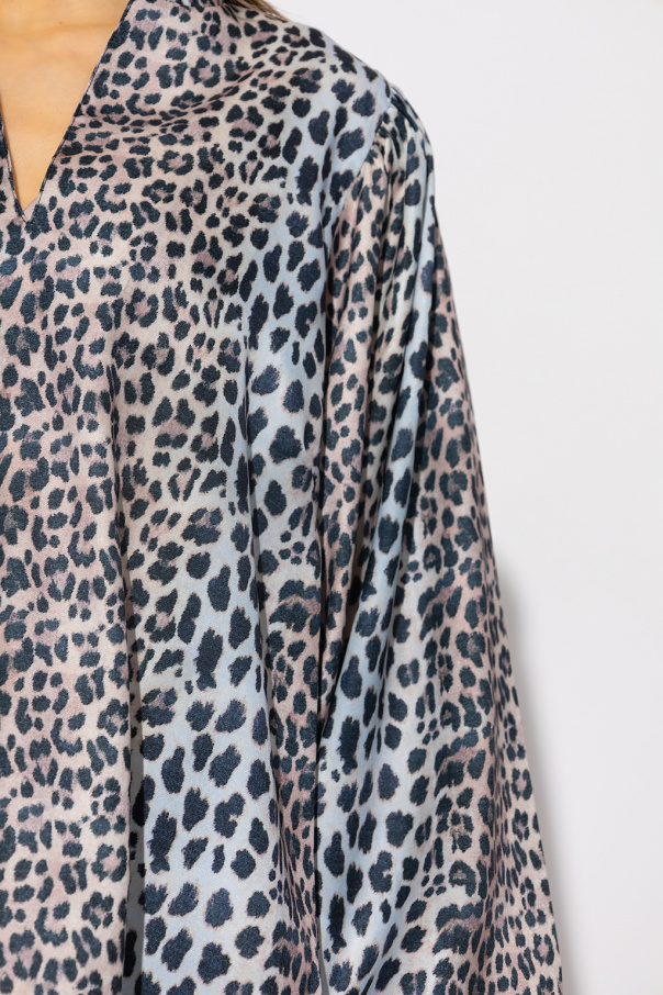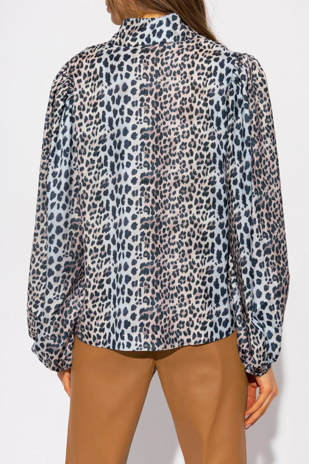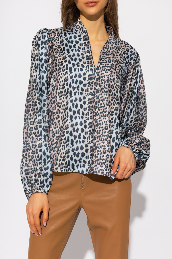 Beige and light blue ‘Claire’ top from Notes Du Nord. Made of satin with a relaxed silhouette, this style showcases a black and brown gradient animal motif, a V-neckline with a standing collar and puff sleeves with elasticated cuffs.