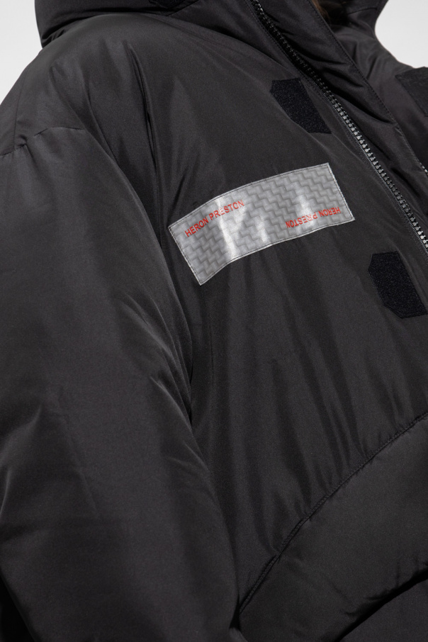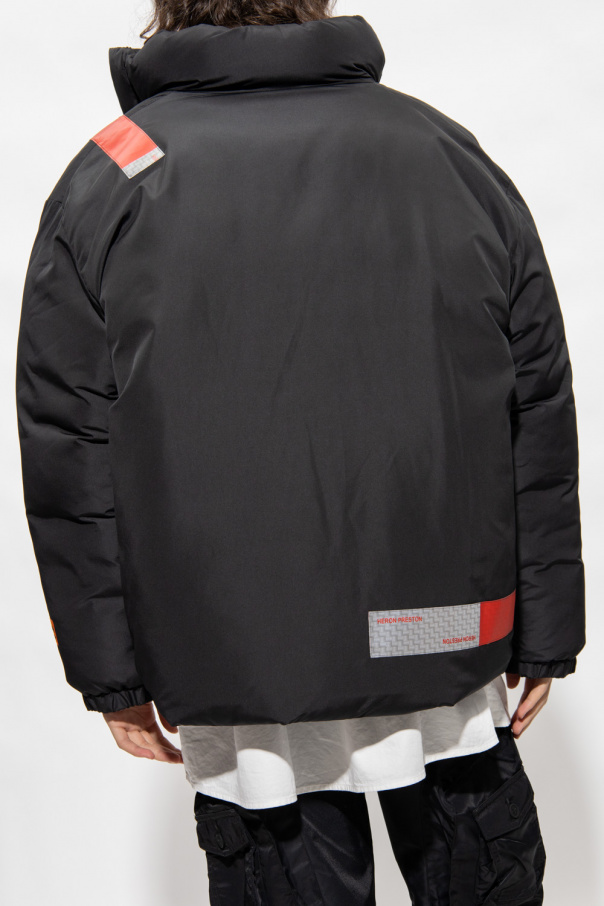 Black jacket with a standing collar from Heron Preston. Embellished with a grey and red reflective insert with a logo, this style fastens with a zipper and a velcro closure and features a drawcord-adjustable hem, two zip front pockets and long sleeves – one has an orange logo patch.