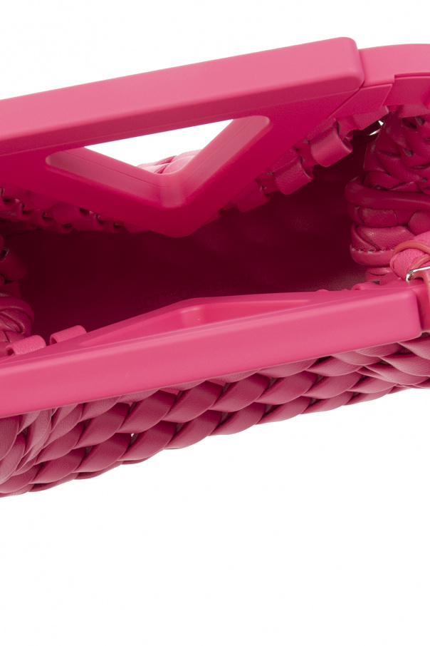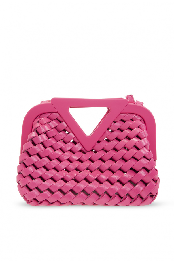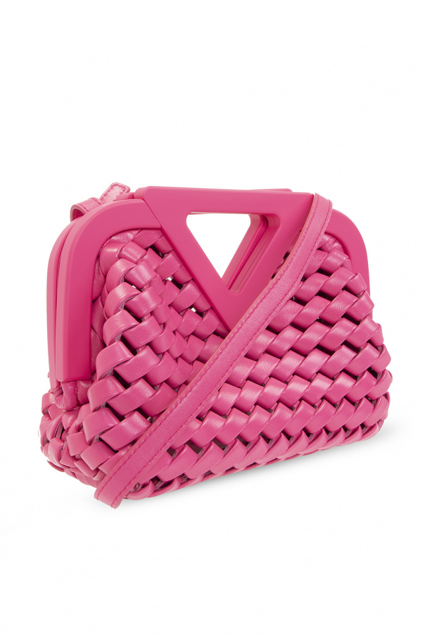 Pink ‘Point Small’ woven shoulder bag from Bottega Veneta. Accentuated with the brand\'s signature triangular handle, this design features a magnetic fastener, an adjustable shoulder strap, silver-tone metal hardware and one internal compartment.
