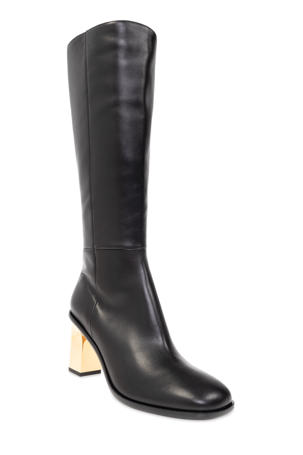 Black ‘Rebecca’ ankle boots from Chloe. Made from smooth leather, this model sits on a brown leather sole and features a side zipper and a gold-tone heel.