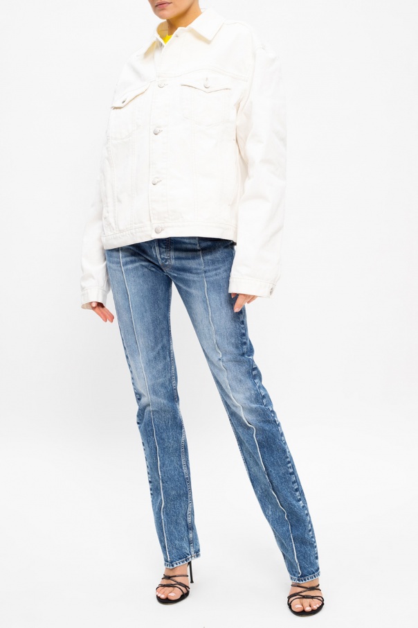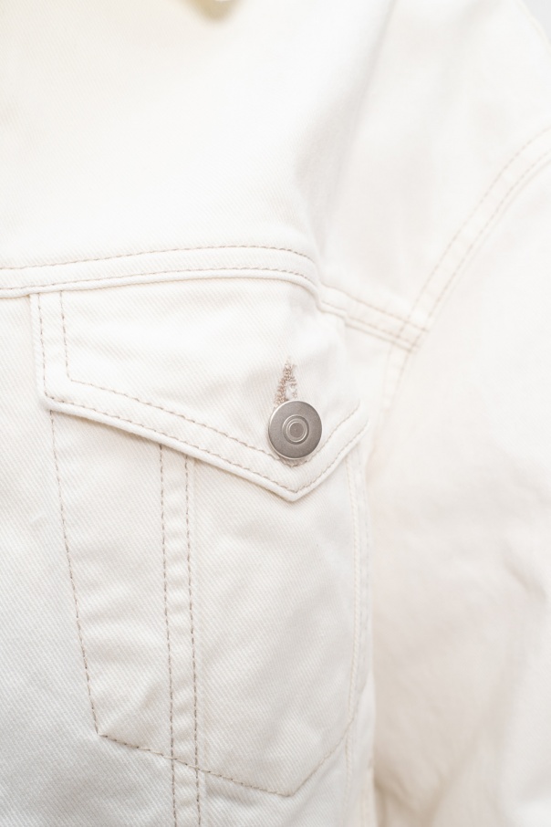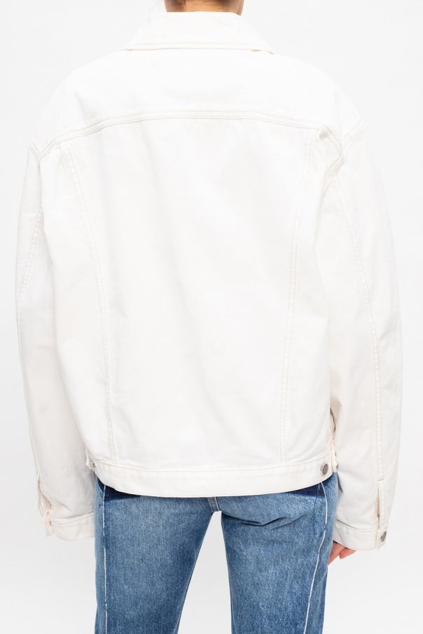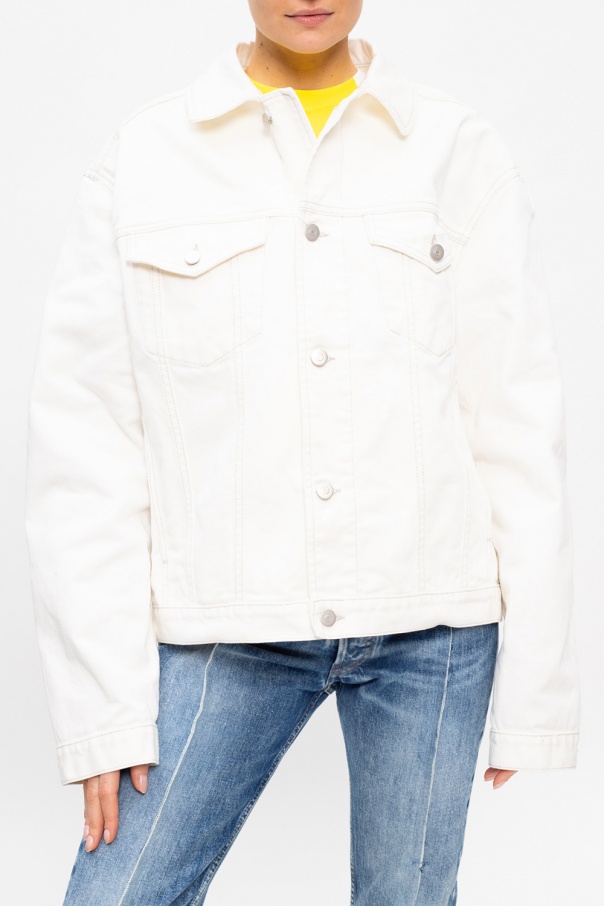 White denim jacket from Maison Margiela. Crafted in cotton, this trucker jacket fastens via buttons and employs two welt side pockets, two button-fastened chest pocket and distinctively exposed beige stitching details.