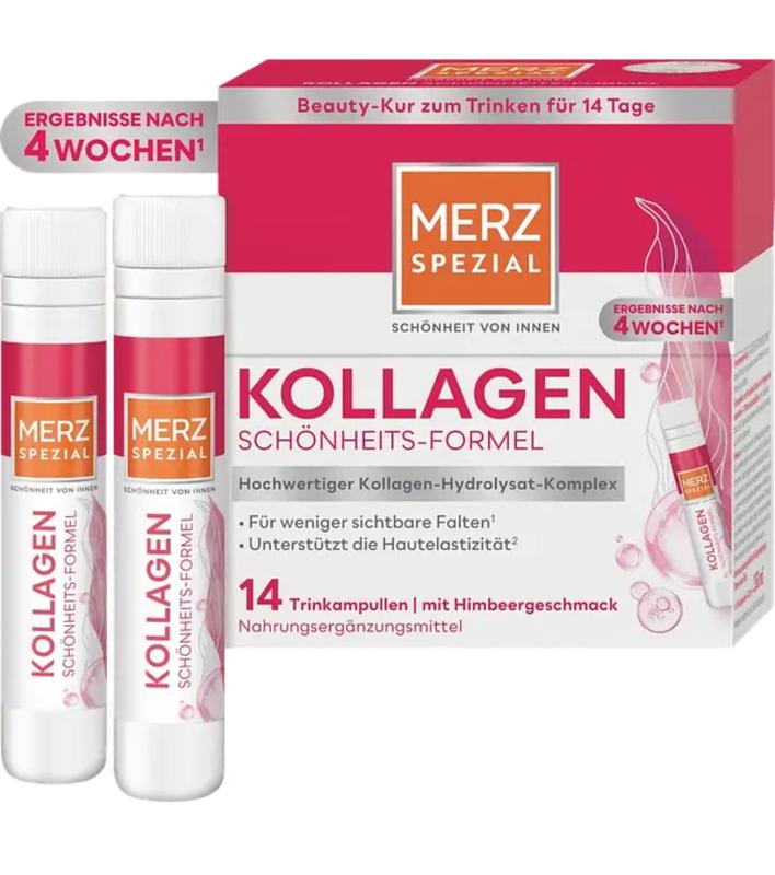 Описание Биологически активная добавка Merz Spezial Kollagen Schönheits-Formel * С комплексом гидролиза коллагена. * Поддерживает эластичность кожи. * Питательные ампулы Merz Special Collagen Beauty Formula содержат особую комбинацию высококачественных коллагеновых пептидов и хорошо сбалансированных питательных веществ для кожи. * Витамин С способствует нормальному образованию коллагена для нормального функционирования кожи. * Ниацин, биотин и цинк способствуют поддержанию нормальной кожи. * Специальный коллаген проникает в более глубокие слои кожи и заметно повышает эластичность кожи и подтягивает ее изнутри. * Обеспечивает заметное разглаживание кожи. * Применение: выпивайте содержимое раз в день. * Не принимайте других препаратов, содержащих биотин. Биотин 1000 мкг Цинк 4 мг Ниацин 16 мг Витамин С 80 мг Витамин Е 6 мг