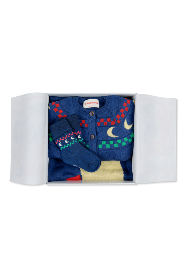 Indulge your little one in the epitome of luxury and comfort with the BOBO CHOSES exclusive Komplet: koc, kombinezon i skarpety. This exquisite set, crafted from a refined blend of organic cotton, wool, and recycled cotton, epitomizes the fusion of elegance and functionality. The navy blue onesie is adorned with a charming Scandinavian-inspired pattern, featuring hues of green, red, yellow, and white, creating an aesthetically pleasing ensemble. The onesie is designed with button closures, ensuring ease of dressing and undressing. Complementing the onesie is a matching navy blue blanket, embellished with geometric motifs and a distinctive moon pattern on one corner, offering both warmth and style. The set is completed with a pair of navy blue socks, showcasing a harmonious design that mirrors the onesie, crafted from soft, elastic knit for ultimate comfort. Presented in an elegant white box emblazoned with the BOBO CHOSES logo, this set is the quintessential gift for discerning parents seeking unparalleled quality and sophistication for their child. Why Choose This Product? Premium Materials: Crafted from organic cotton, wool, and recycled cotton for ultimate comfort. Exclusive Design: Scandinavian-inspired patterns and vibrant colors for a unique aesthetic. Ease of Use: Button closures on the onesie for convenient dressing. Perfect Gift: Elegantly packaged in a branded box, ideal for special occasions. Environmental Consciousness: Made by BOBO CHOSES, a brand committed to sustainability and creativity.