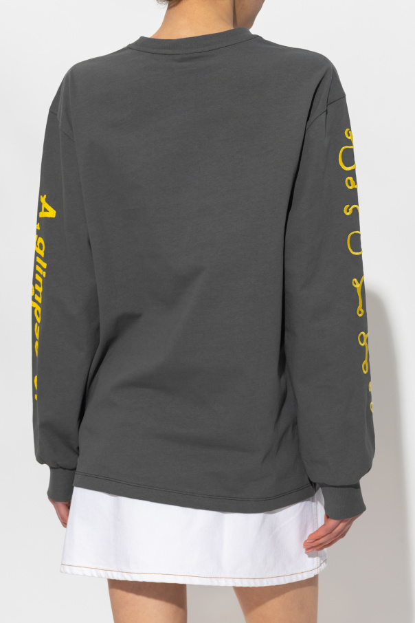 Dark grey crewneck T-shirt from Ganni. Crafted from a blend of organic cotton and recycled cotton, this style features a printed logo pattern, yellow logo embroidery, long sleeves and ribbing on the collar.