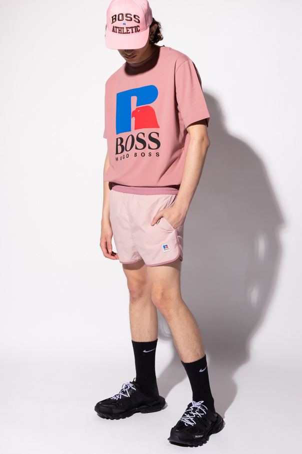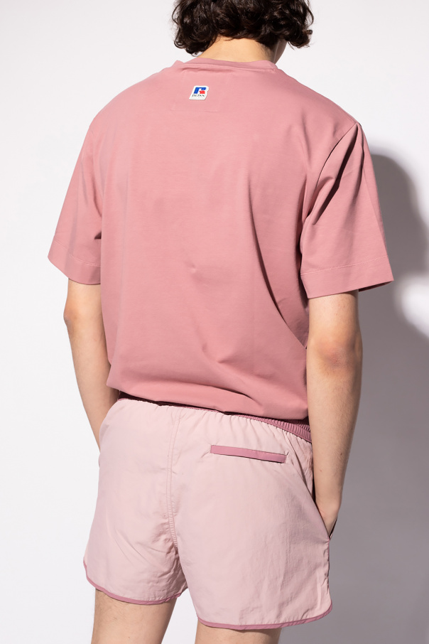 Dark pink crewneck T-shirt from BOSS x Russell Athletic. Crafted from cotton, this style showcases the brand\'s logo printed in black, blue and red. The collaboration presents bold, off-court classics that combine relaxed fits, sporty details, and a retro-inspired colour palette.