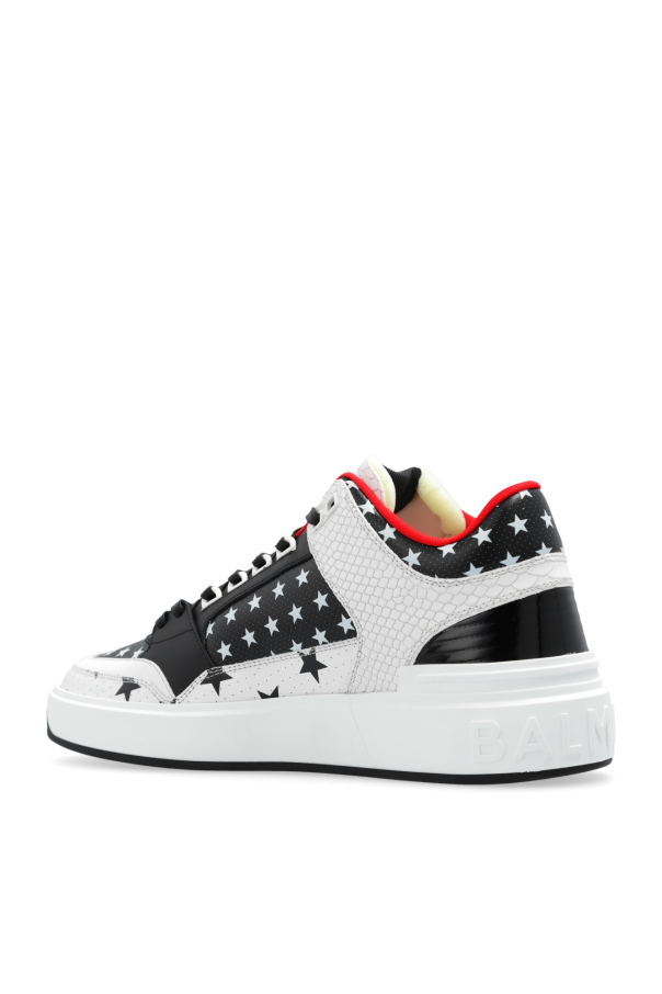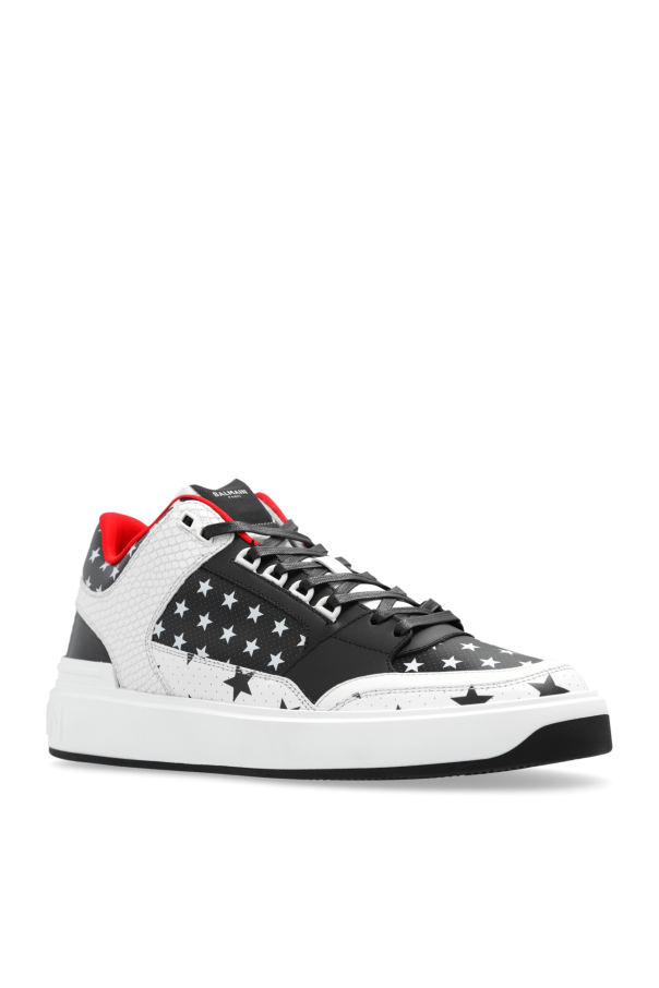 Black, white and red ‘B-Court Mid’ sneakers from Balmain. Made from leather with a slip-on silhouette, this lace-up model sits on a black rubber sole and showcases a round toe and a pattern with stars.