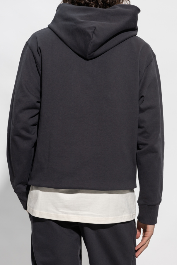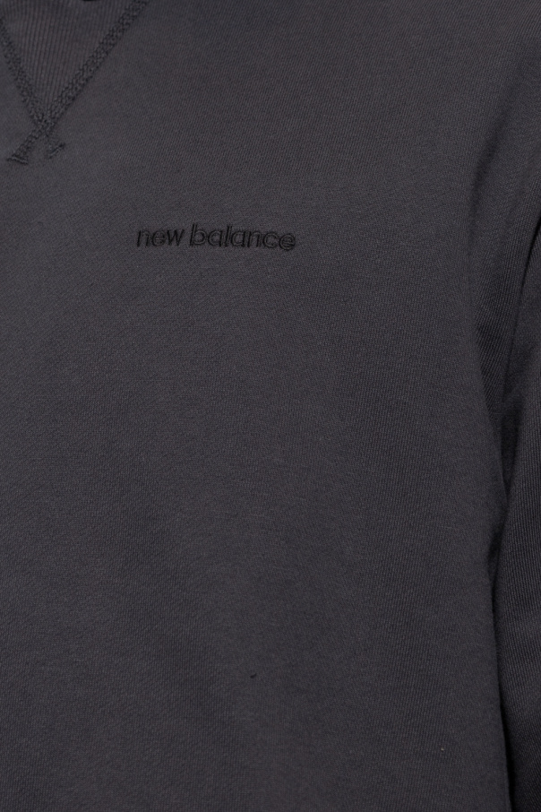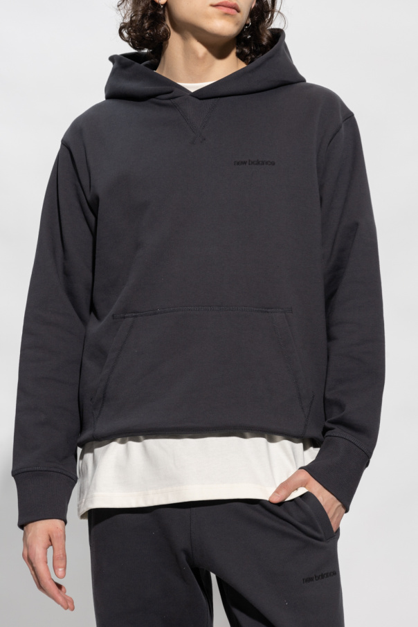 Dark grey hoodie from New Balance. Crafted from cotton, this style features a kangaroo pocket, logo embroidery and an elasticated bottom hem and long sleeves.