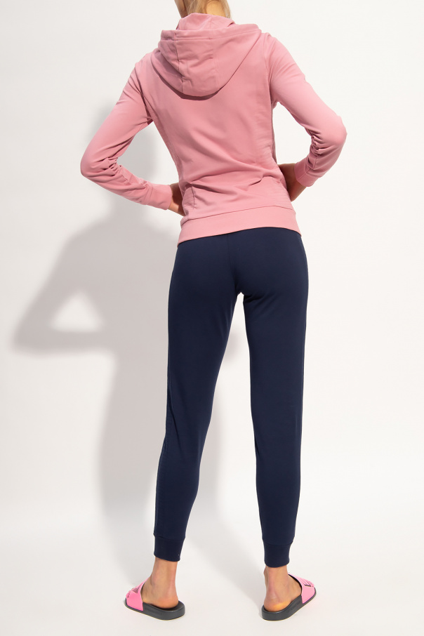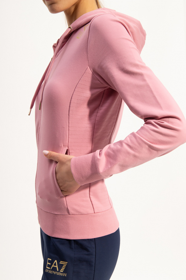 Pink and purple sweatshirt & sweatpants set from EA7 Emporio Armani. Hoodie fastens via a zip and features a gold-tone logo print, two slip pockets, a drawcord-adjustable hood and elasticized trims on the bottom hem and cuffs. Tapered-leg trousers feature an elasticated waistband with a drawstring fastening, two slip pockets and ribbed cuffs.