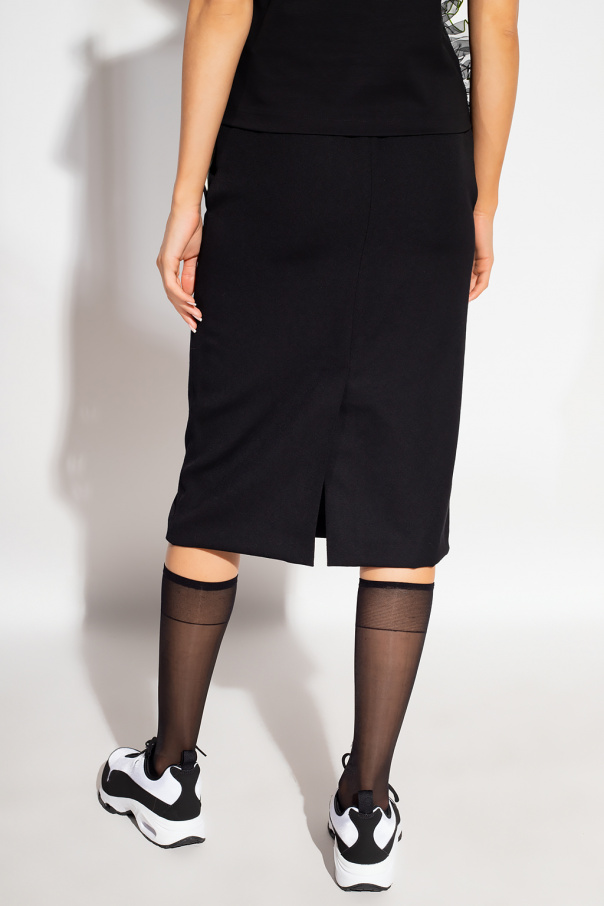 Black skirt from Comme des Garcons. Crafted from wool, this style features an elasticated waistband, two frontal pockets and a back vent.