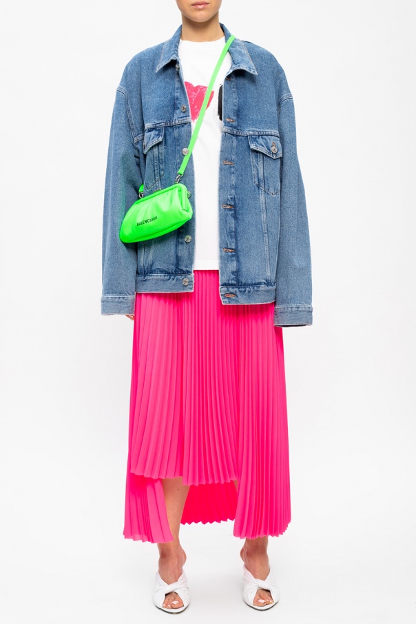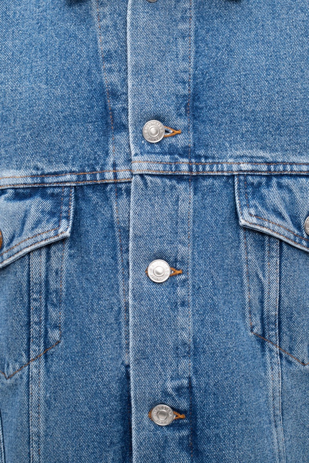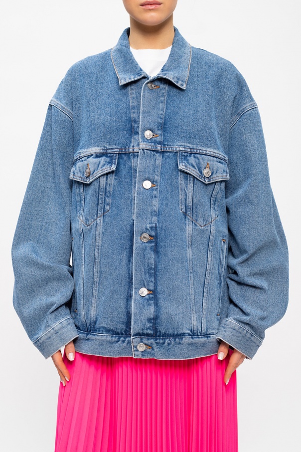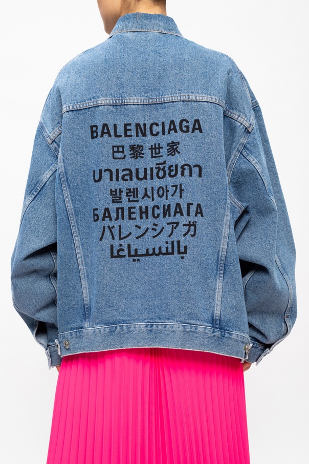 Blue denim jacket from Balenciaga. Crafted from washed-out cotton, this style fastens via buttons and showcases a black graphic print with the brand\'s logo and exposed orange topstitching details. Two side welt pockets and two flapped chest pockets with button closures complete the look.