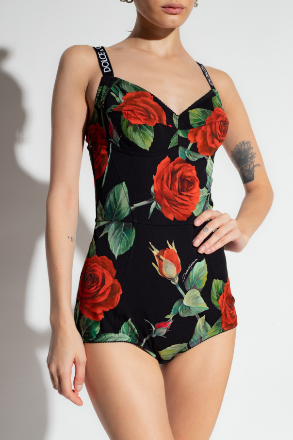 Black body from Dolce & Gabbana. Crafted from a silk blend, this garment is complete with a back zip and hook fastening, fitted silhouette with underwires, multicolored rose pattern and adjustable shoulder straps with a logo embroidery.