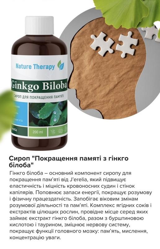 200 мл. Знакомьтесь – гинкго билоба - растение с действительно впечатляющими характеристиками и свойствами, которое становится все более популярным для использования в медицине. И это не удивительно, ведь компоненты, входящие в состав листьев этого дерева-долгожителя, оказывают мощное положительное влияние прежде всего на мозг человека, активизируя его работу и останавливая возрастные дегенеративные изменения. Гинкго билоба – основной компонент сиропа для улучшения памяти от J’erelia, который повышает эластичность и прочность кровеносных сосудов и стенок капилляров. Пополняет запасы энергии, улучшает умственную и физическую работоспособность. Предупреждает возрастные изменения умственной деятельности и памяти. Кроме того, фитосироп – дополнительный источник натуральных витаминов, полисахаридов, флавоноидов, и других биологически-активных веществ. Комплекс ягодных соков и экстрактов целебных растений, проводимое место среди которых занимает экстракт гинкго билоба, вместе с янтарной кислотой и таурином, укрепляет нервную систему, улучшает функции головного мозга: память, мышление, концентрацию внимания.