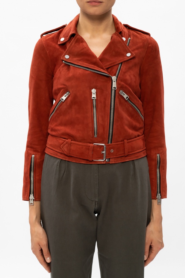 Brown ‘Balfern’ biker jacket from AllSaints. Crafted from suede, this model fastens via zip and employs three zip pockets, buckle belt at the waist and silver-tone metal hardware.