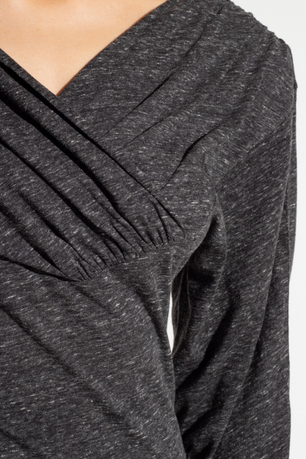 Grey ‘Larra’ short dress from Iro. Crafted from a cotton blend, this fitted design features a wrap-over neckline and long fitted sleeves with detachable shoulder pads.