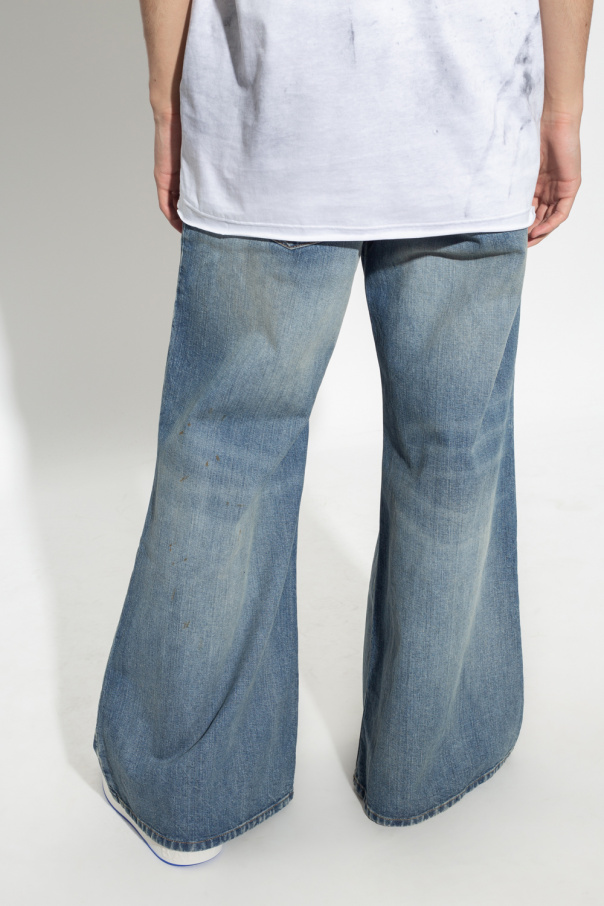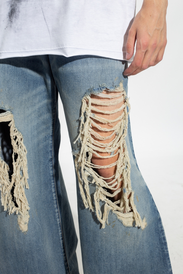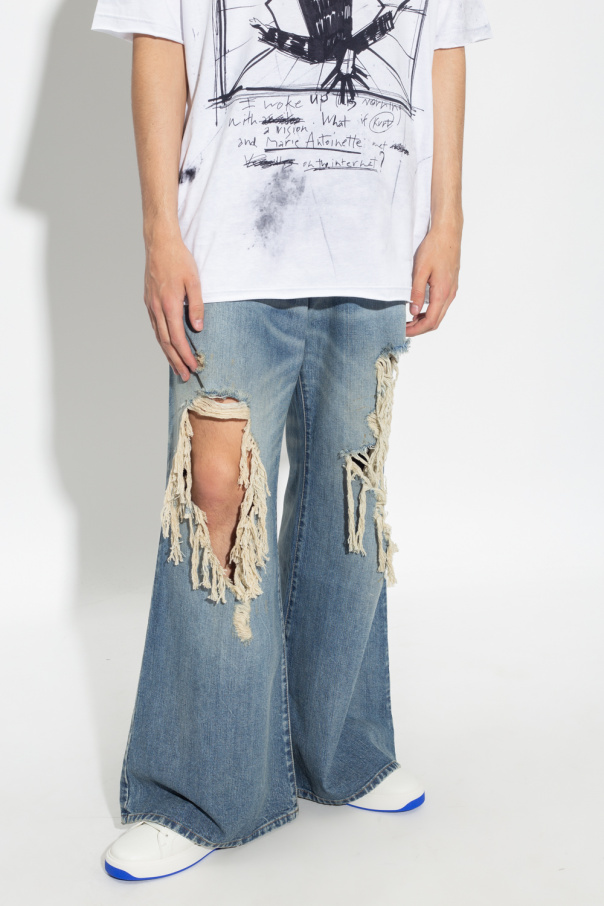 Blue loose-fitting distressed jeans from Balmain. This high-waisted pair features a decorative button and zip fastening, vintage effect, black logo patch, five slip pockets, metal appliqué and flared legs.