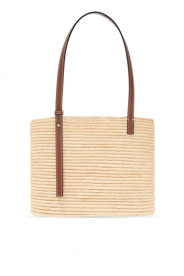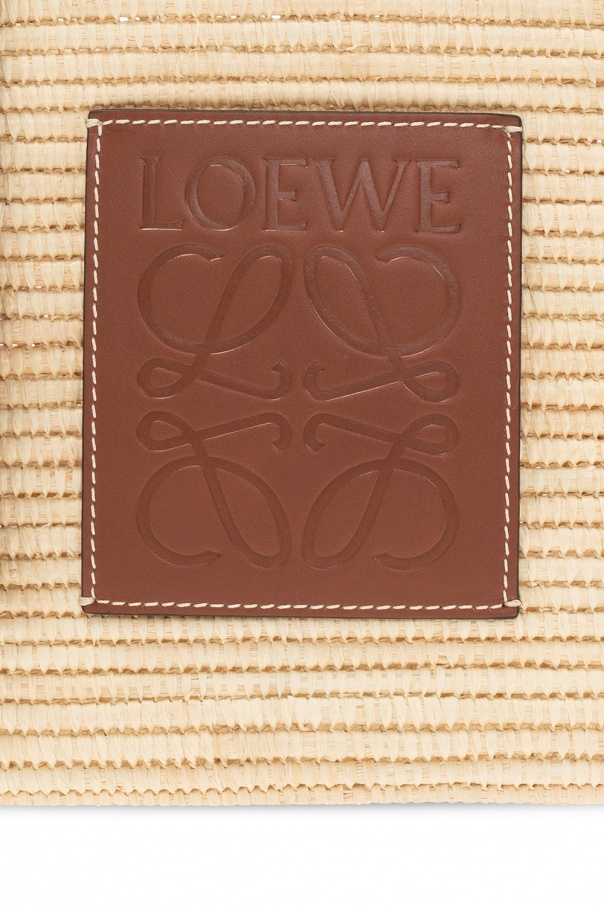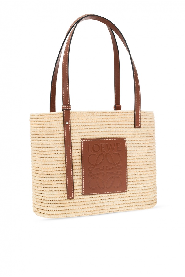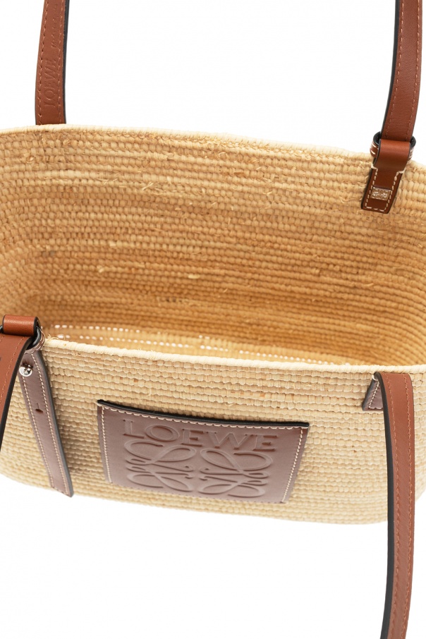 Beige shopper bag from Loewe, size small. Woven from raffia with brown calf leather trims, this model features a logo-embossed front pocket, two adjustable half-round, one internal compartment and silver-tone metal hardware.
