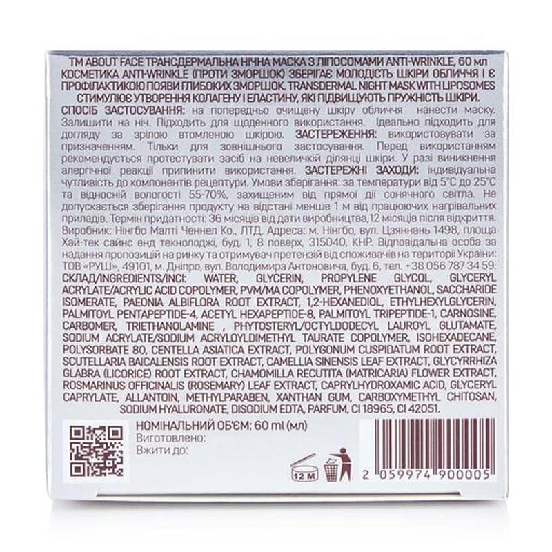 Трансдермальная ночная маска для лица ABOUT face эбаут фейс Anti-Wrinkle с липосомами, 60 мл Характеристики товара Трансдермальная ночная маска для лица ABOUT face Anti-Wrinkle с липосомами, 60 мл Бренд ABOUT Страна производства Китай Вид Маска для лица Класс Масс-маркет Возрастная категория 55+ Назначение Антивозрастной От морщин Тип кожи Для всех типов кожи Объём 60 Описание товара Трансдермальная ночная маска для лица ABOUT face Anti-Wrinkle с липосомами, 60 мл Трансдермальная ночная маска ABOUT face — универсальный продукт, который поможет улучшить состояние кожи. Преимущества продукта Средство идеально подходит для зрелой уставшей кожи. Можно использовать ежедневно. Обеспечивает улучшение цвета лица, тонус и сияние кожи. Как действует? Комплекс растительных экстрактов шлемника байкальского, корня солодки, ромашки, розмарина, а также аллантоин и липосомы значительно улучшают состояние кожи, обеспечивает ей глубокое увлажнение и тонус. Бьюти-советы Перед применением маски тщательно очистите и тонизируйте кожу. 1–2 раза в неделю используйте скраб или пилинг для более глубокого очищения и удаления ороговевшего слоя, чтобы компоненты маски проникали лучше. Состав товара Трансдермальная ночная маска для лица ABOUT face Anti-Wrinkle с липосомами, 60 мл Water, Glycerin, Propylene Glycol, Glyceryl Acrylate/Acrylic Acid Copolymer, Pvm/Ma Copolymer, Phenoxyethanol, Saccharide Isomerate, Paeonia Albiflora Root Extract, 1,2-Hexanediol, Ethylhexylglycerin, Palmitoyl Pentapeptide-4, Acetyl Hexapeptide-8, Palmitoyl Tripeptide-1, Carnosine, Carbomer, Triethanolamine , Phytosteryl/Octyldodecyl Lauroyl Glutamate, Sodium Acrylate/Sodium Acryloyldimethyl Taurate Copolymer, Isohexadecane, Polysorbate 80, Centella Asiatica Extract, Polygonum Cuspidatum Root Extract, Scutellaria Baicalensis Root Extract, Camellia Sinensis Leaf Extract, Glycyrrhiza Glabra (Licorice) Root Extract, Chamomilla Recutita (Matricaria) Flower Extract, Rosmarinus Officinalis (Rosemary) Leaf Extract, Caprylhydroxamic Acid, Glyceryl Caprylate, Allantoin, Methylparaben, Xanthan Gum, Carboxymethyl Chitosan, Sodium Hyaluronate, Disodium Edta, Parfum, Ci 18965, Ci 42051. Как использовать Трансдермальная ночная маска для лица ABOUT face Anti-Wrinkle с липосомами, 60 мл Нанесите маску на сухую чистую кожу лица вместо крема за 30–60 минут до сна. Не смывайте. Утром необходимо удалить остатки маски средством для умывания.