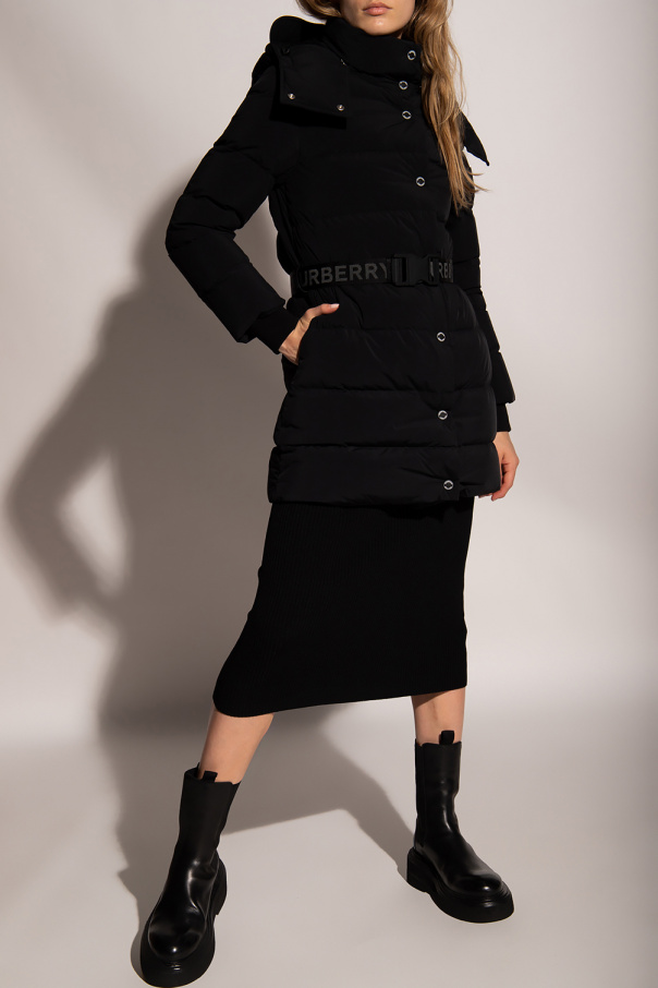 Black quilted coat from Burberry. Filled with goose down, this style fastens via a zip and snaps and showcases a detachable hood with cinching drawstrings, two zipped pockets, a rubberised logo patch on the sleeve and an included branded belt.