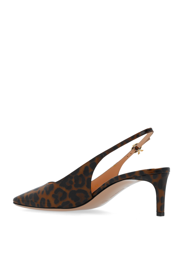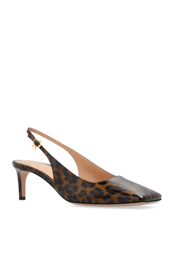 Introducing elegant high-heeled shoes from an exclusive women\'s collection, designed by the renowned Gianvito Rossi. The Christina model embodies the essence of sophisticated style and luxury. The shoes feature a classic stiletto shape with an open heel, adding elegance and lightness. The slim kitten heel, low and subtle, ensures comfort and stability. The entire surface of the shoes is covered with a leopard print pattern, adding boldness and fashion-forward character. Made from patent leather, shiny and luxurious, they attract attention. Details like the gold buckle with a decorative element on the strap around the heel and the square toe highlight a modern twist on a classic model. The interior of the shoes, finished with light beige leather, ensures wearing comfort. Why should you buy this product? Elegant and bold design. Made from luxurious patent leather. Slim, comfortable kitten heel. Unique leopard print pattern adding fashion extravagance. Details include a gold buckle with a decorative element. Interior finished with soft, beige leather for ultimate comfort.