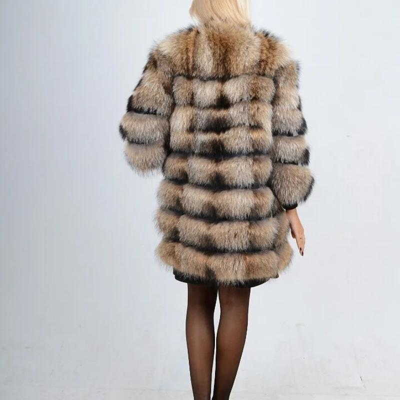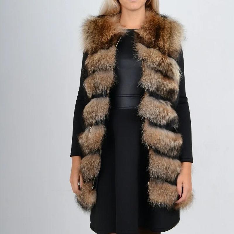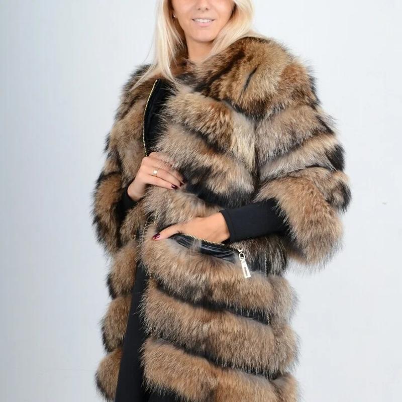 Натуральный мех енота Функциональная шуба-трансформер с карманами из натурального меха. Рукава отстегиваются, что позволяет носить ее как жилет. Стильный молодежный фасон соответствует последним тенденциям меховой моды. Изделие сшито из поперечных меховых полос и кожи. Длина рукава — ¾. Тип застежки — молния.