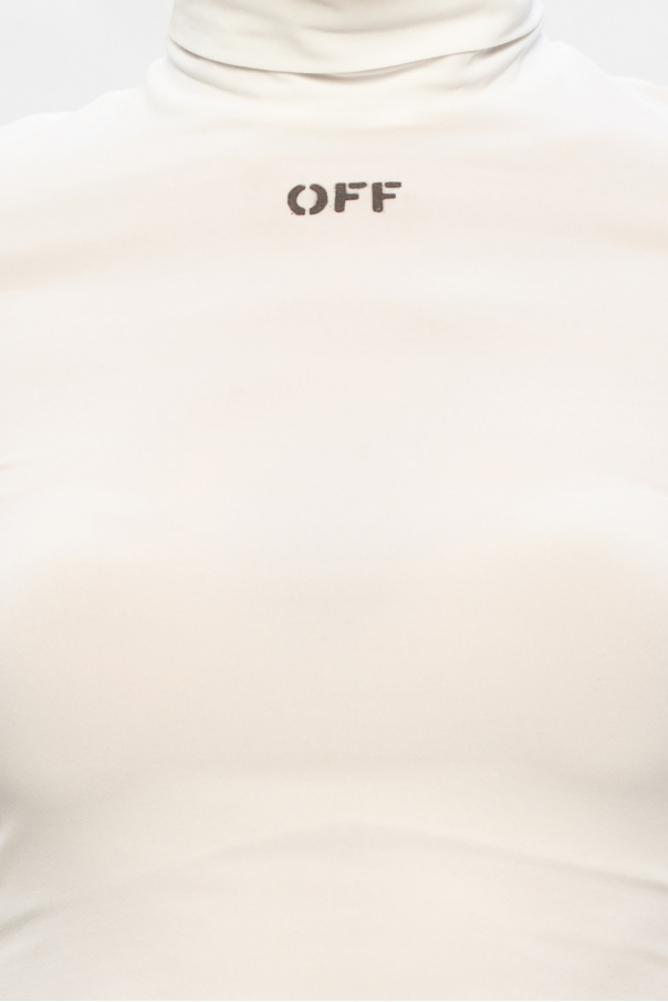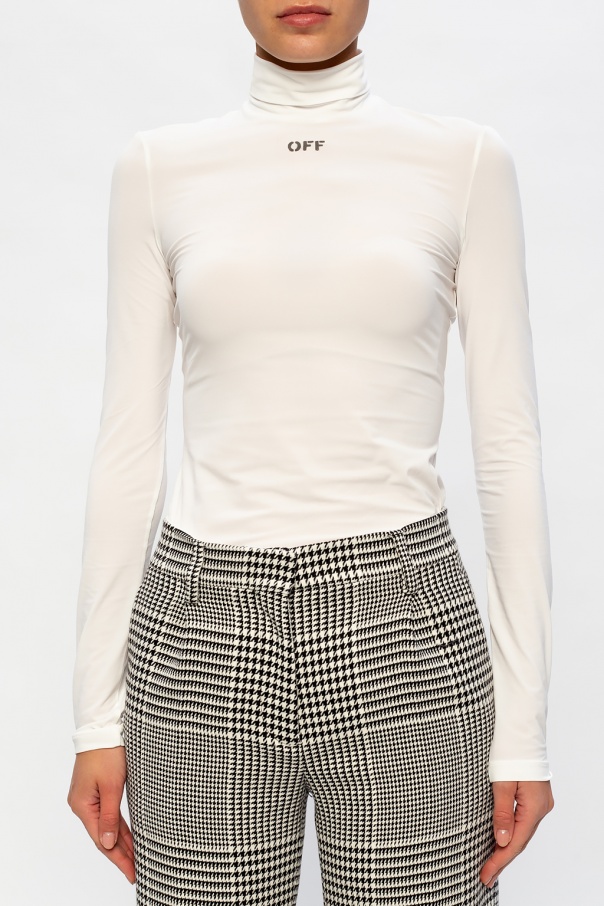 White top from Off-White. Printed with the label\'s logo in grey, this style is complete with a roll neck and an elasticated bottom hem and cuffs.