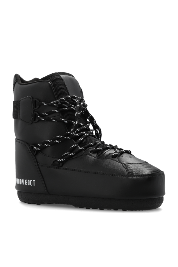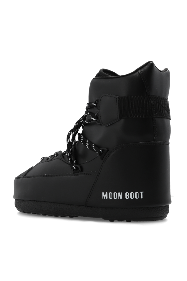 Black ‘Sneaker Mid’ snow boots from Moon Boot. Made of waterproof material, this lace-up model sits on a black tread rubber sole with suction cups to ensure superb grip on any surface and showcases a perforated front and a printed logo. This model is inspired by basketball style, while its oversized, insulated silhouette is reminiscent of the original 1969 design.