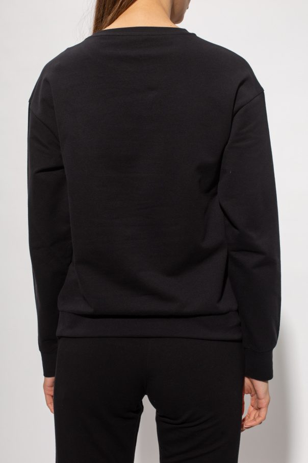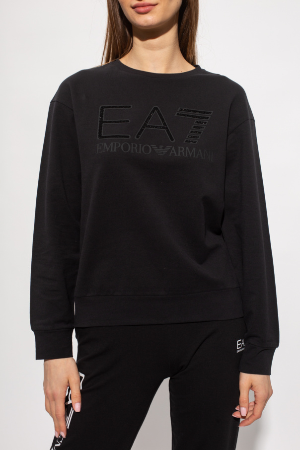 Black crewneck sweatshirt from EA7 Emporio Armani. Made of cotton, this garment is enriched by a rubber logo embellished with crystals and ribbed trims at the neck, hem and cuffs.