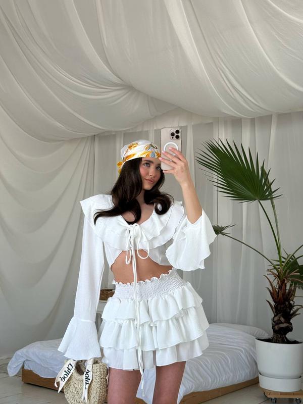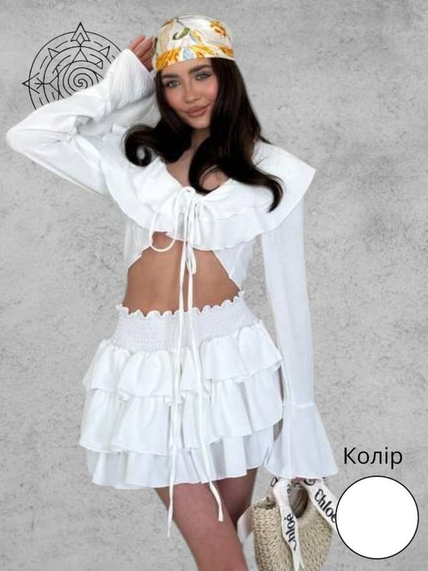 Костюм, который нужен каждой 🤍 Легкая, пышная юбка в сочетании с топом 😍 Мод 248 Видео и фото реал ✅ Тканина : креп жатка Размеры : 42/46 ( один размер ) Цвета: молоко Есть видео обзор