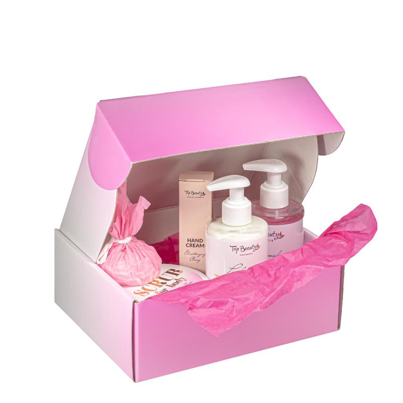 Подарочный набор для женщин Top Beauty "Розовый" -- бокс из 5 парфюмированных средств уходовой косметики Ищете идеальный подарок для женщины, которая ценит заботу о себе? Бокс с набором уходовой косметики для тела "Розовый" от украинского бренда косметики Top Beauty станет отличным выбором! Продукты подарочного набора содержат натуральные ингредиенты, которые бережно ухаживают за вашей кожей, и радуют восхитительными ароматами. Сет собран в стильную упаковку. В состав подарочного сета входят роскошные средства для ухода за кожей рук и тела: - увлажняющий крем для рук с ароматом вишни (40 мл) -- подарит коже рук мягкость и нежность; - парфюмированный скраб для тела на основе кокосового масла с ароматом маршмеллоу и мускуса (250 мл) -- бережно отшелушит ороговевшие клетки, возвращает коже гладкость и бархатистость; - парфюмированный лосьон для тела с ароматом маршмеллоу и мускуса (250 мл) -- увлажнит и восстановит вашу кожу, подарит ей шелковистость и эластичность; - парфюмированный гель для душа с ароматом маршмеллоу и мускуса -- нежно очистит кожу, без ощущения стянутости и сухости, подарит заряд энергии и приятный аромат; - свечка ароматическая с ароматом Sorbet (как Esсada - Sorbeto Roso) - 1 шт. Подарите себе и своим близким незабываемые моменты сладкого блаженства в бьюти-рутине с подарочным набором уходовой косметики от Top Beauty!
