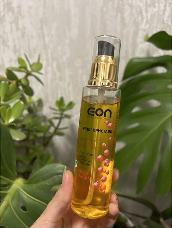 Рідкі кристали від українського бренду EON Professional Gold Argana містять кератин і натуральне масло Аргана, які регенерують пошкоджені ділянки, згладжують волосяні кутикули, заповнюють порожнечі, склеюють розшарується кінчики і попереджають їх подальше руйнування. Засіб дарує пасмам шовковистість, м'якість і блиск. Він допомагає впоратися з неслухняними завитками, полегшує процес розчісування і перешкоджає сплутування волосся. Рідкі кристали уповільнюють процеси дегідратації і надійно захищають локони від згубних факторів навколишнього середовища. Спосіб застосування: нанести кілька крапель рідких кристалів на вимиті і підсушені рушником, але ще вологе волосся, потім приступити до звичайної сушінні волосся. Засіб можна наносити навіть на сухі укладене волосся. Головне, щоб шкіра голови і волосся було чистим.