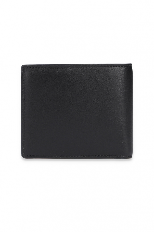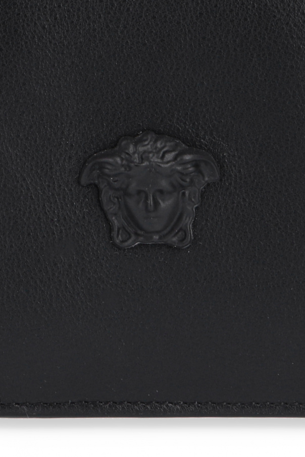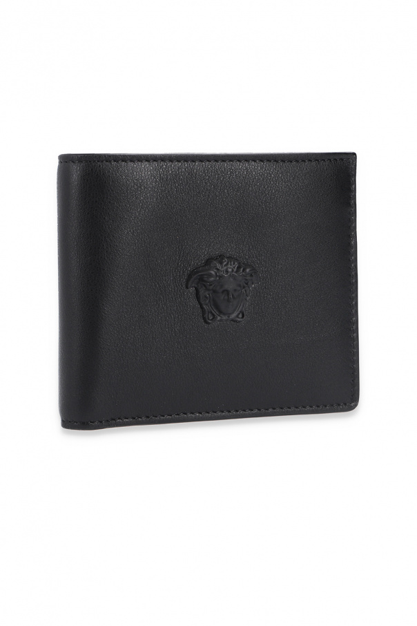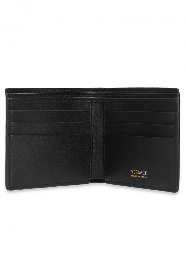 Black bi-fold wallet from Versace. Crafted from leather, this design showcases the brand\'s signature Medusa plaque on the front and two bill compartments, two slip pockets and six card slots inside.