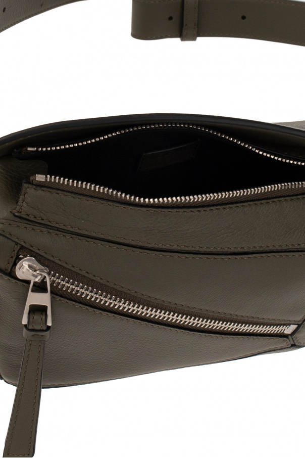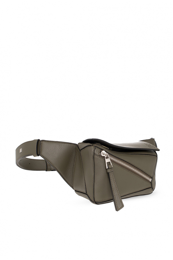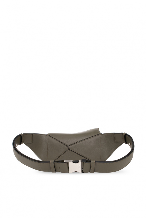 Green ‘Puzzle’ belt bag from Loewe. Made of calf leather, this model features a zip fastening, geometric stitching details, embossed logo, front zip pocket, adjustable belt, one internal compartment and silver-tone metal hardware.