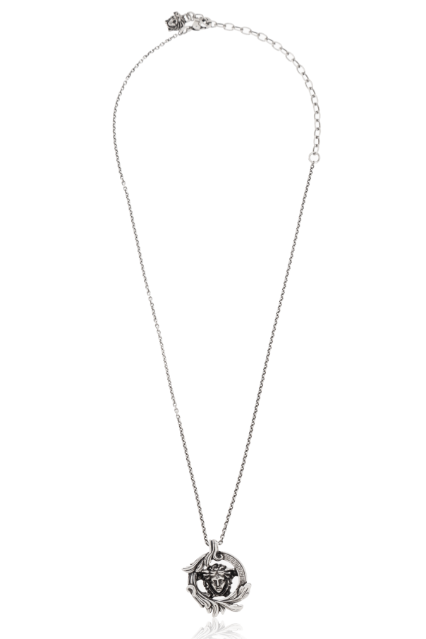 Introducing the Versace Pendant Necklace, an exquisite piece from an exclusive fashion collection. This necklace embodies a classic, elegant design with its slender chain and intricately detailed pendant. The pendant, a hallmark of luxury, features the iconic Medusa head surrounded by ornate patterns, reflecting Versace\'s signature use of mythological motifs. Crafted from high-quality silver-toned metal, this unisex accessory exudes sophisticated elegance and versatility, complementing an array of styles. The pendant\'s meticulous detailing underscores the exceptional craftsmanship synonymous with Versace. This silver masterpiece is an emblem of universal appeal, making it suitable for both men and women. The Versace brand, renowned for its fusion of Italian tradition and modern innovation, is a testament to the creative culture that celebrates individuality and bold expression. Why Choose This Product? Timeless and elegant design Crafted from premium silver-toned metal Intricately detailed Medusa pendant Universal and unisex appeal A creation by the iconic Versace brand